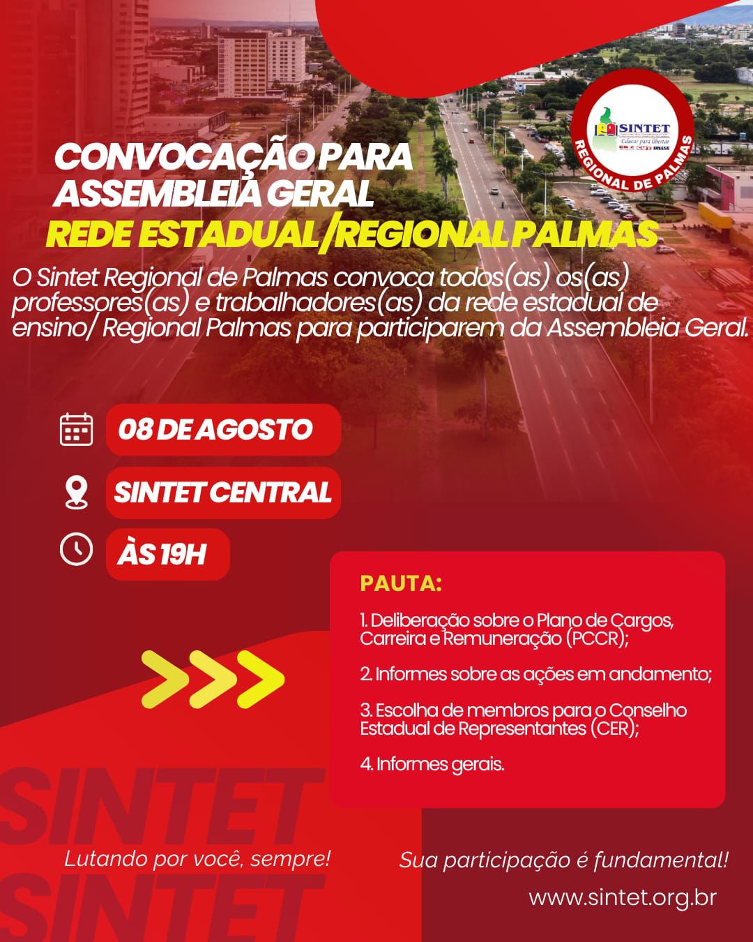 O Sintet Regional de Palmas convoca todos (as) os (as) professores (as) e trabalhadores (as) da rede estadual para participarem da Assembleia Geral, a ser realizada no dia 08 de agosto de 2025 (sexta-feira), às 19h, na sede do Sindicato, com o objetivo de discutir e deliberar sobre a mobilização do PCCR e outras demandas de interesse da categoria.