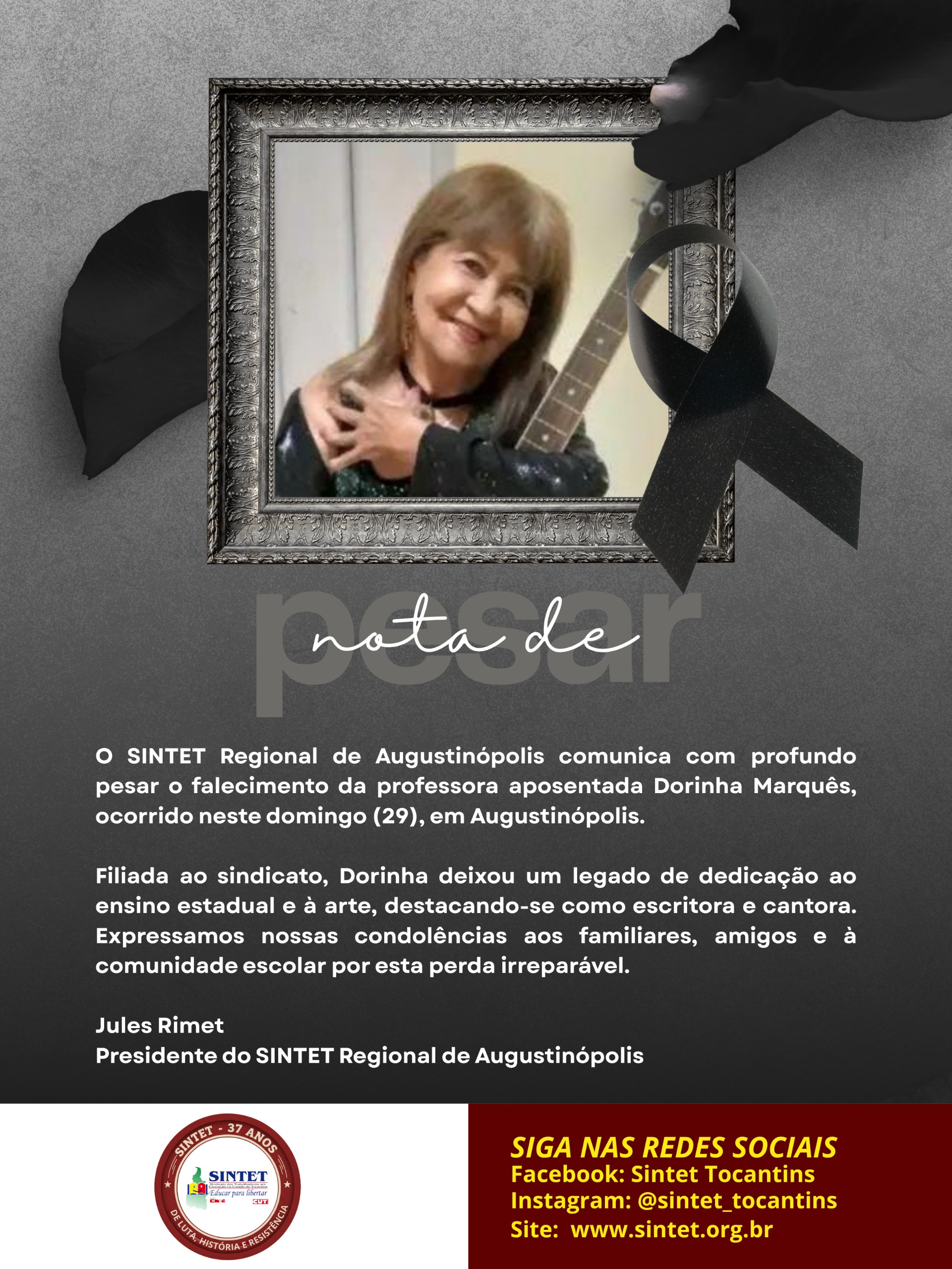 Educadora dedicada e voz ativa na cultura de Augustinópolis, Dorinha será lembrada por seu talento e sensibilidade. O SINTET se solidariza com a família e amigos neste momento de dor.