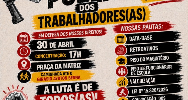 O dirigente também reforça que o ato será um espaço para dialogar sobre reivindicações urgentes, como o fim da escala 6x1, a garantia de direitos e a valorização dos profissionais da educação nas redes municipal e estadual.