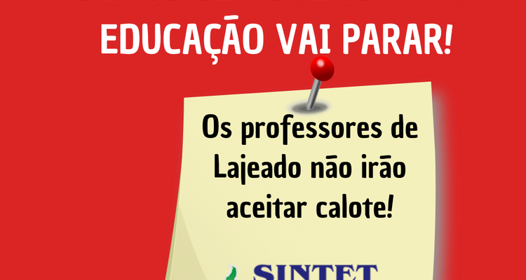 O presidente do Sintet Regional de Miracema, Iata Anderson, anunciou nesta sexta-feira, 04 de novembro, uma paralisação da educação em Lajeado, na terça -feira, 08 de novembro. O protesto é contra a intransigência do Prefeito Júnior Bandeira que insiste na aprovação na Câmara Municipal de projetos de lei que incidem na desvalorização da carreira dos professores.