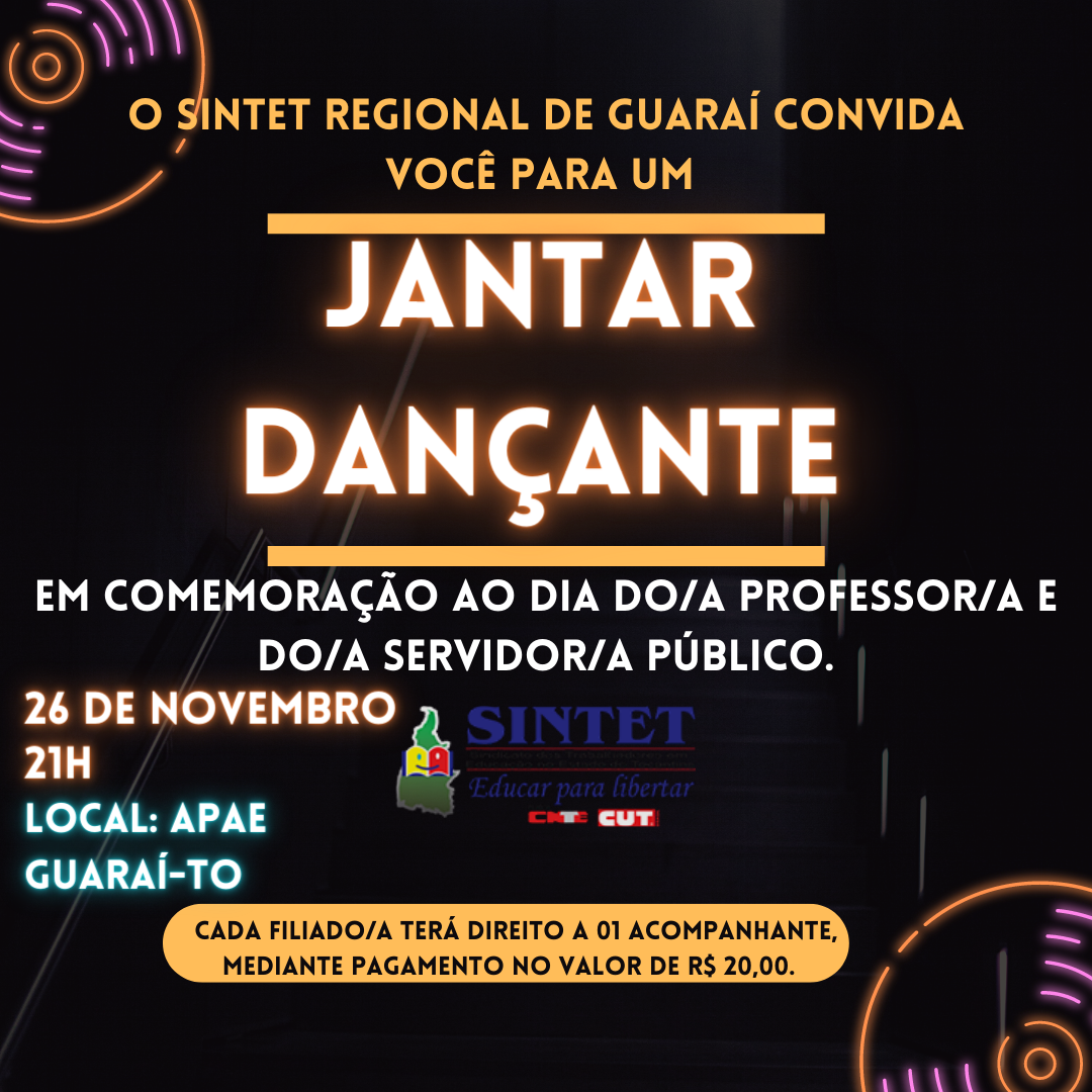 Em Guaraí, Sintet vai realizar um baile dançante para comemorar o Dia do/a Professor/a e do/a Servidor/a Público - funcionário de escola, dia 26 de novembro.