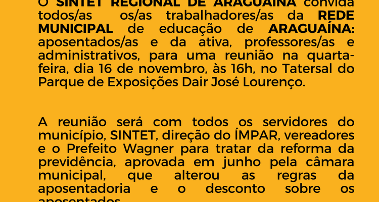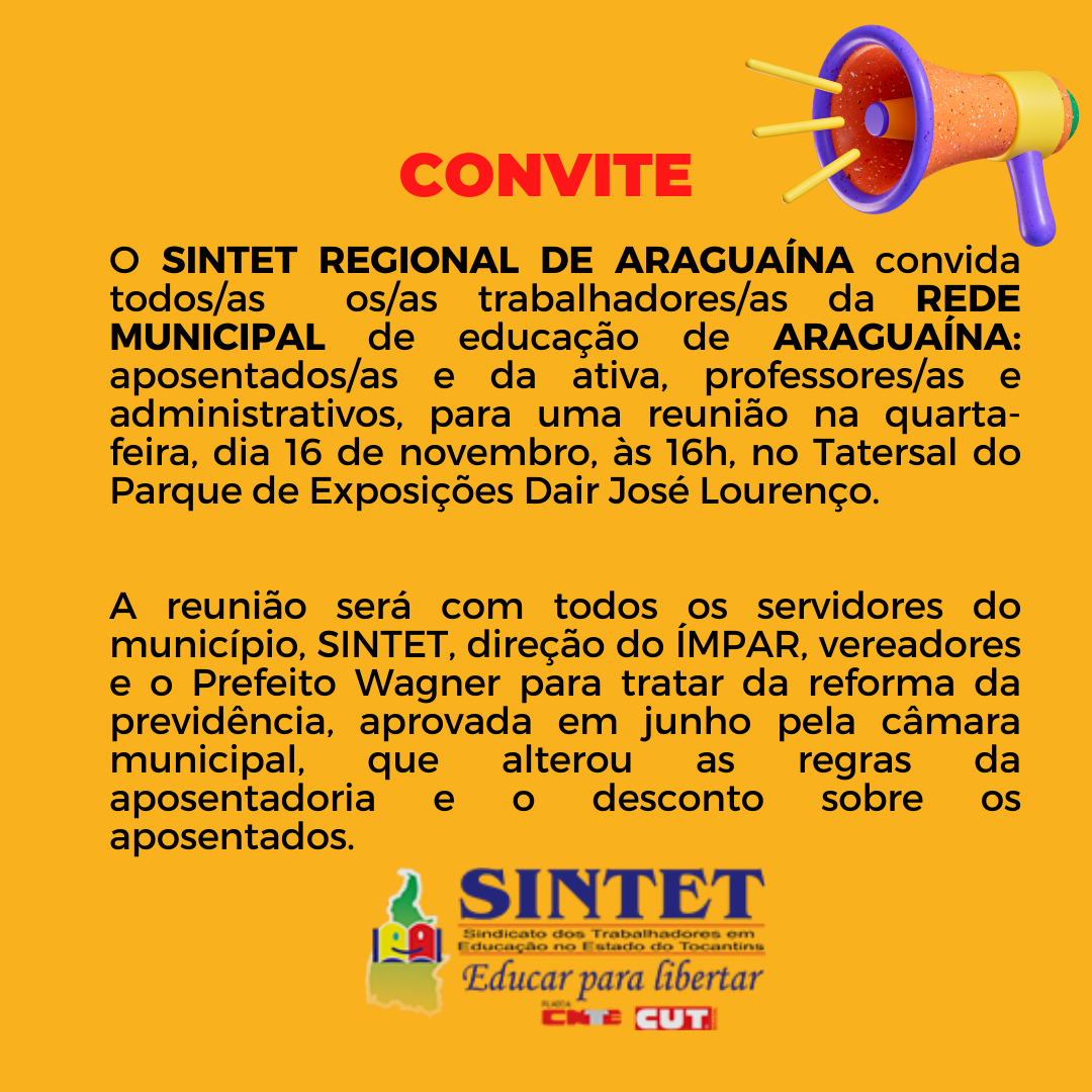 OSINTET REGIONAL DE ARAGUAÍNAconvida todos/as os/as trabalhadores/as daREDE MUNICIPALde educação deARAGUAÍNA:aposentados/as e da ativa, professores/as e administrativos, para uma reunião na quarta-feira, dia 16 de novembro, às 16h, no Tatersal do Parque de Exposições Dair José Lourenço.