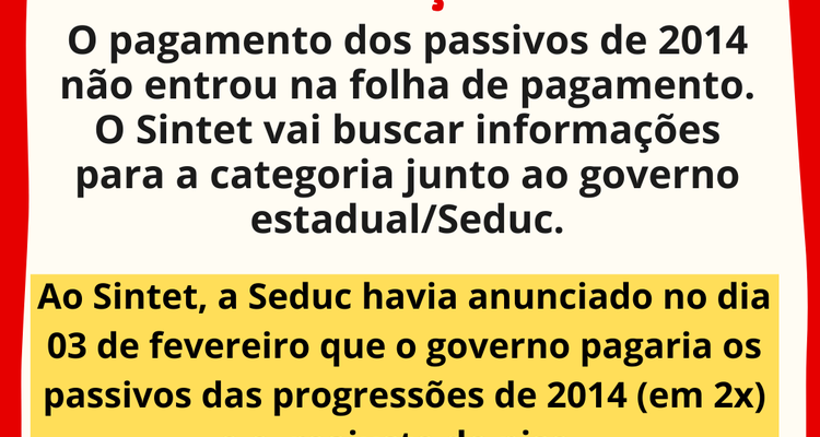 O pagamento dos passivos de 2014 não entrou na folha de pagamento. O Sintet vai buscar informações para a categoria junto ao governo estadual/Seduc.