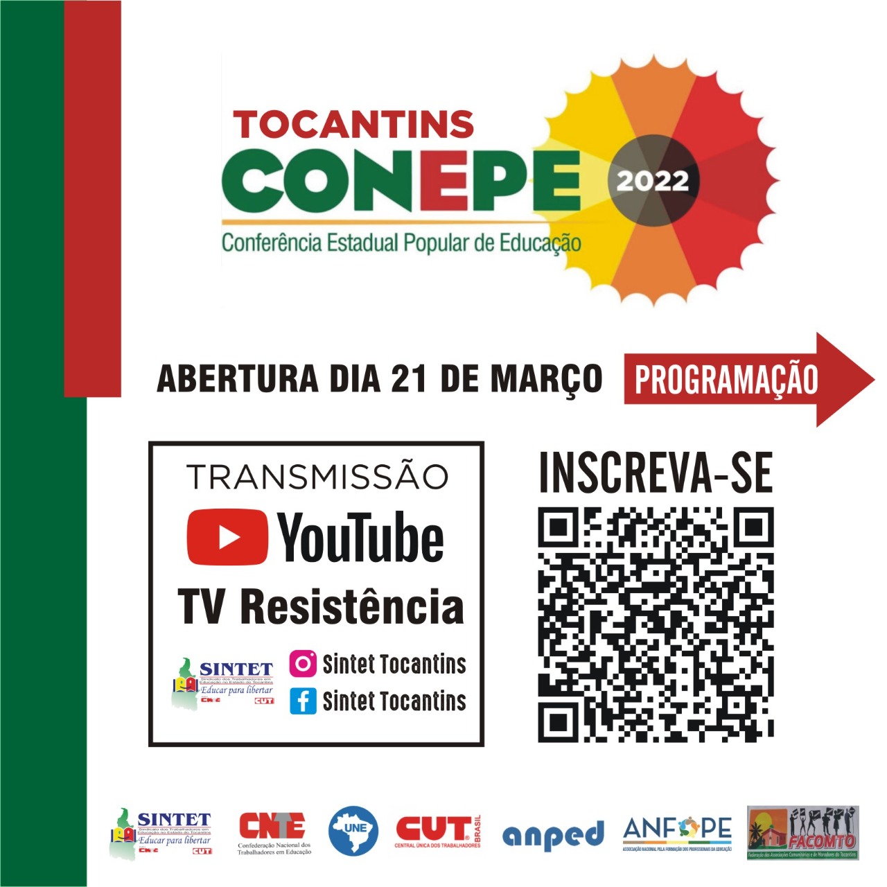 A Conferência Estadual organiza o debate sobre as proposições para a Conferência Nacional Popular de Educação, que será realizada de forma presencial e virtual no mês de julho de 2022, em Natal-RN. O Lançamento da CONEPE-TO será online dia 21 de março.