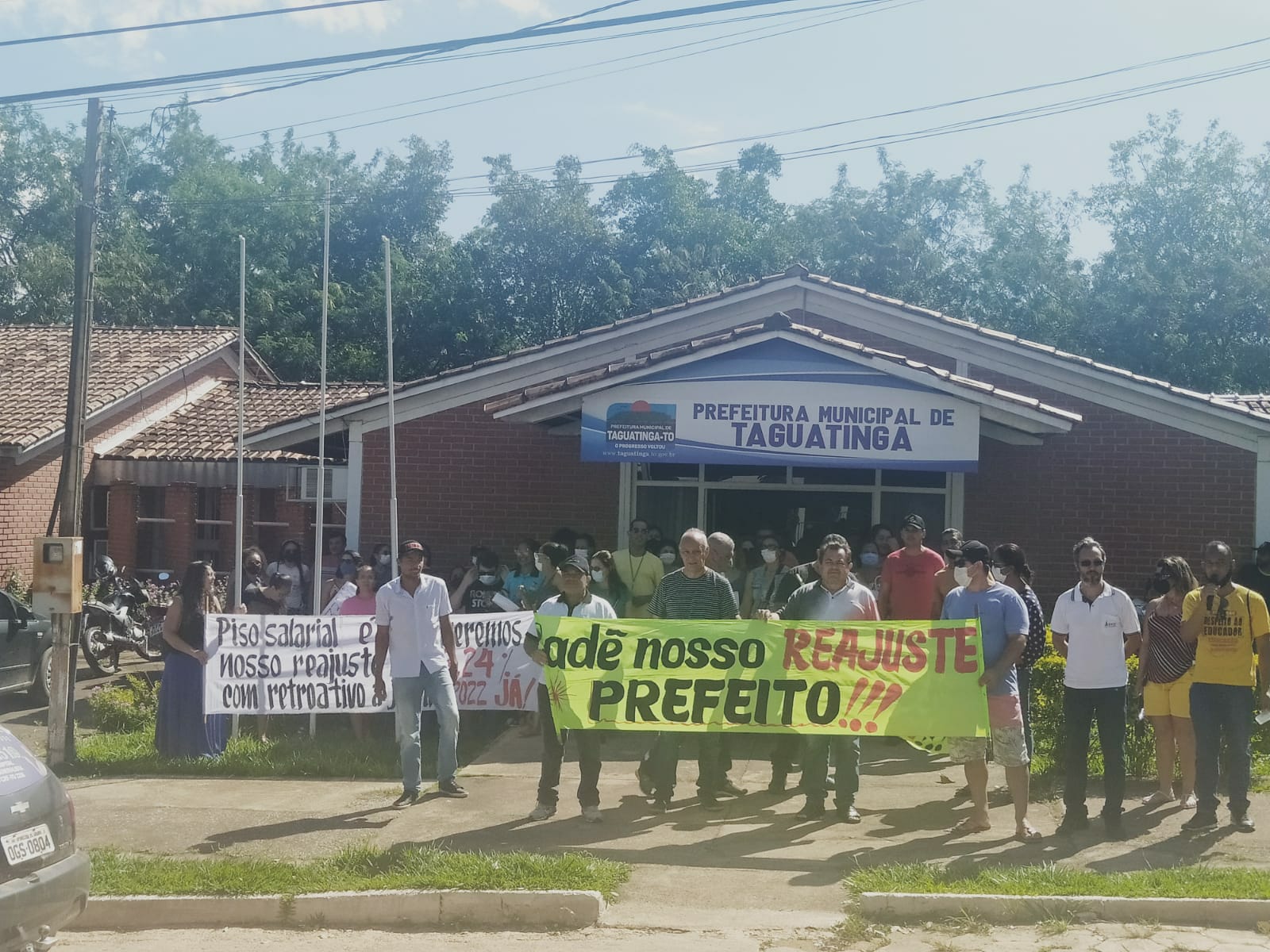 Com carro de som, faixas e cartazes com dizeres: Pague o piso, prefeito Paulo Roberto e Cadê nosso reajuste, Prefeito, o ato foi encerrado na porta da Prefeitura. Uma funcionária do paço chegou a usar um drone para filmar o ato público na tentativa de intimidar os manifestantes.