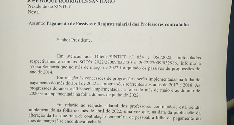 A partir das queixas recebidas da categoria, o Sindicato dos Trabalhadores em Educação no Estado do Tocantins (Sintet) protocolou ofícios ao Secretário Estadual de Educação, Fábio Vaz, com cópia a (SEDUC/SECAD/IGEPREV e CASA CIVIL) pedindo informações sobre o pagamento dos passivos das progressões e datas-bases feitos pelo governo estadual à categoria.