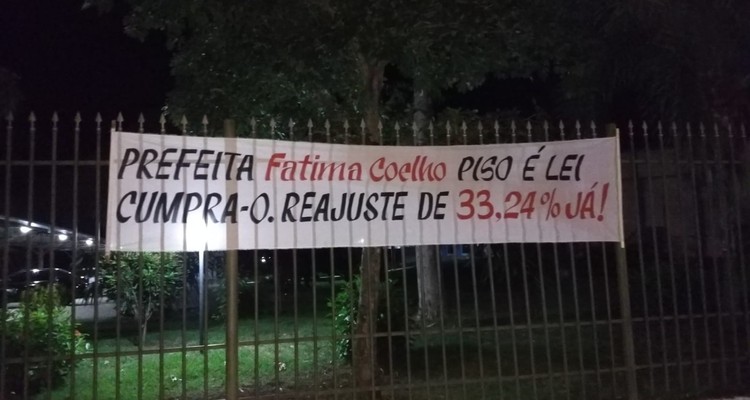 “Prefeita Fátima Coelho, Piso é Lei. Cumpra-o! Reajuste de 33,24% JÁ! ”, diz uma das faixas.