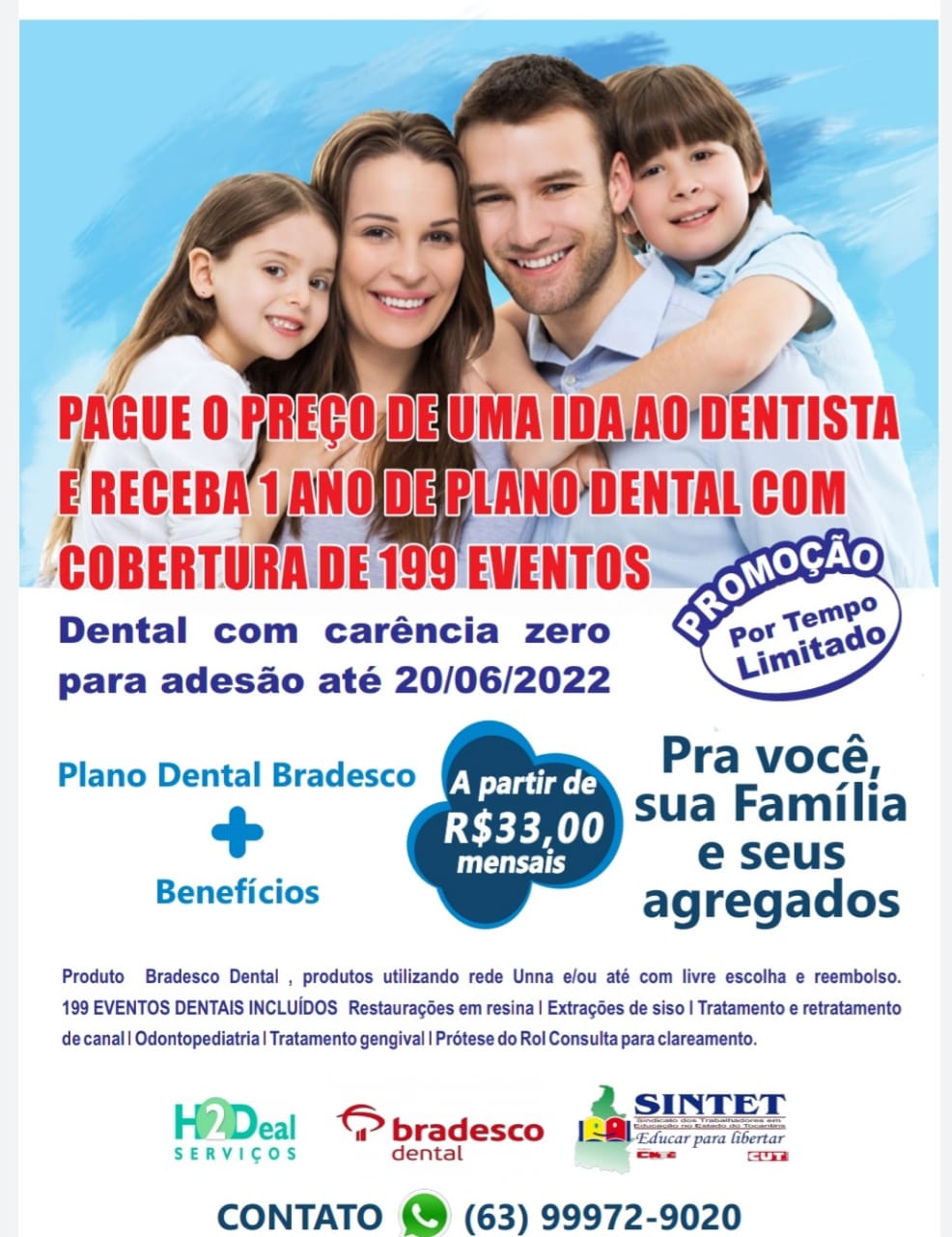 O plano odontológico tem cobertura nacional, oferece 199 eventos dentais com custos a partir de 33 reais por mês