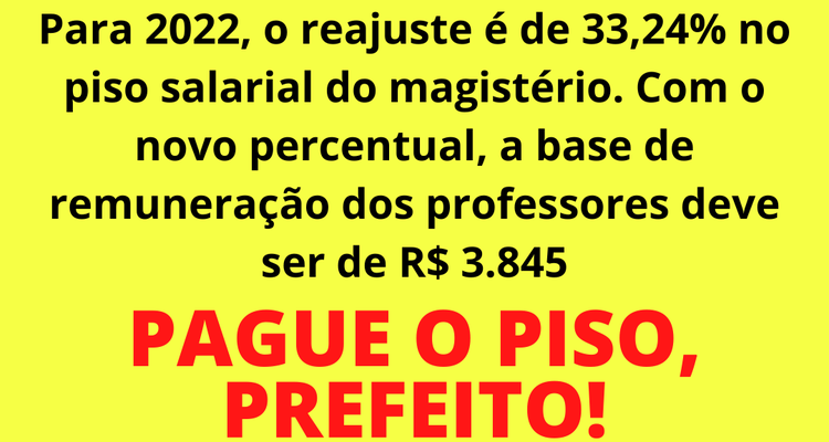 O índice de reajuste do piso para o ano de 2022 é de 33,24% e o prefeito concedeu apenas 10,2%. O piso é estabelecido pela lei federal n° 11.738/2008 e o índice foi estabelecido no mês de fevereiro pela Portaria do governo federal nº 67/2022 que confirma o piso salarial profissional nacional do magistério para o valor de R$ 3.845,63.