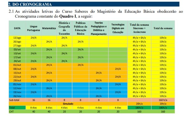 O Curso dispõe de seis módulos de componentes curriculares e um simulado. Semanalmente aos sábados serão ofertados de forma remota dois módulos, assim distribuídos: 2h/a de atividades síncronas (plataforma Youtube Sintet e Neped) e 3h/a de atividades assíncronas (Facebook https://www.facebook.com/saberesmagisterUFT22/?ref=pages_you_manage) de cada componente curricular, totalizando 10h por semana.