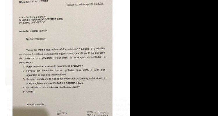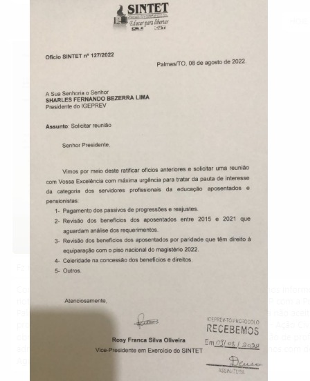 O Sindicato dos Trabalhadores em Educação no Estado do Tocantins (Sintet) protocolou novo ofício nesta terça-feira, 9 de agosto, ao presidente do IGEPREV, Sharlles Fernando Bezerra Lima solicitando uma reunião de máxima urgência para tratar dos interesses da categoria dos servidores profissionais da educação aposentados e pensionistas.