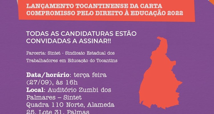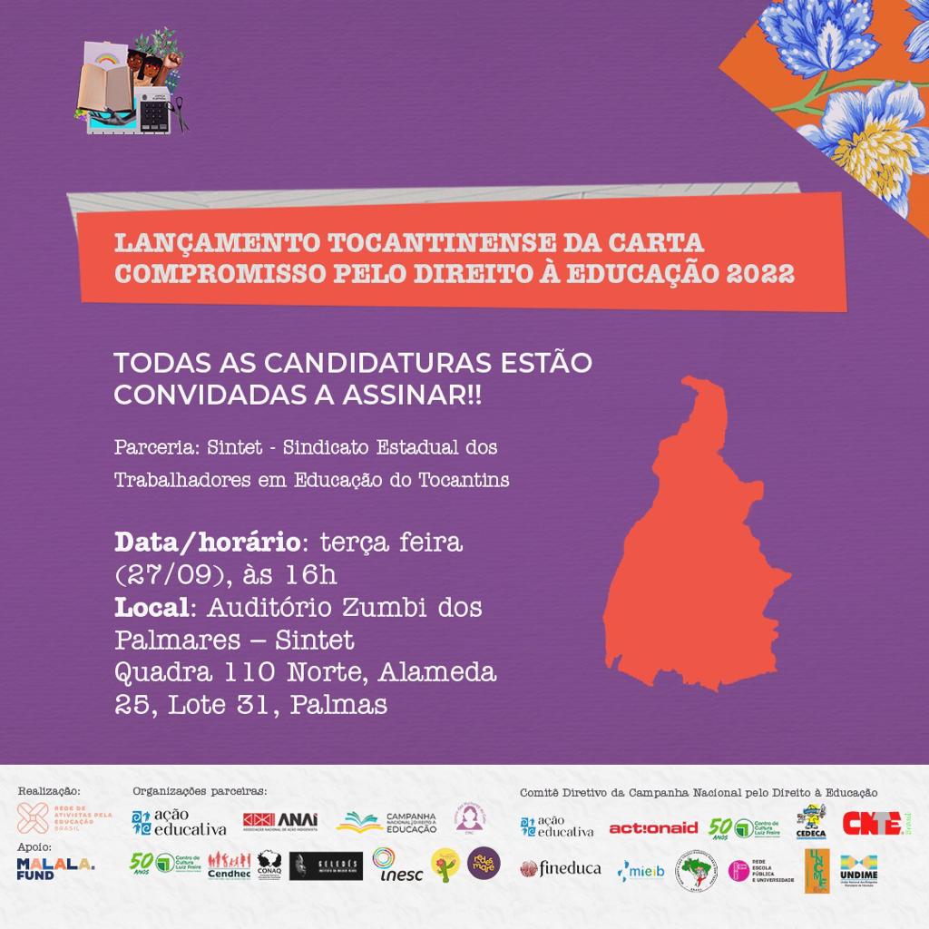 A Rede de Ativistas pela Educação do Fundo Malala no Brasil, junto às organizações que a integram e pela Campanha Nacional pelo Direito à Educação e entidades de seu Comitê Diretivo, em parceria com o Sindicato dos Trabalhadores em Educação no Estado do Tocantins (Sintet), através da regional de Palmas, convida todas as candidaturas para o Lançamento Tocantinense da Carta Compromisso pelo Direito à Educação 2022.