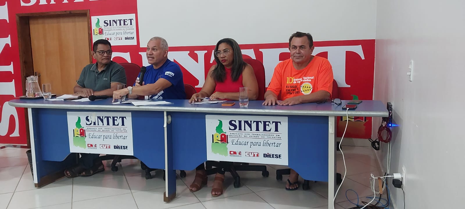 Na mesa, o presidente do Sintet, José Roque Santiago, a vice-presidente Rosy Franca e o Secretário-geral do Sintet e Secretário de Combate ao Racismo da CNTE, Carlos de Lima Furtado.