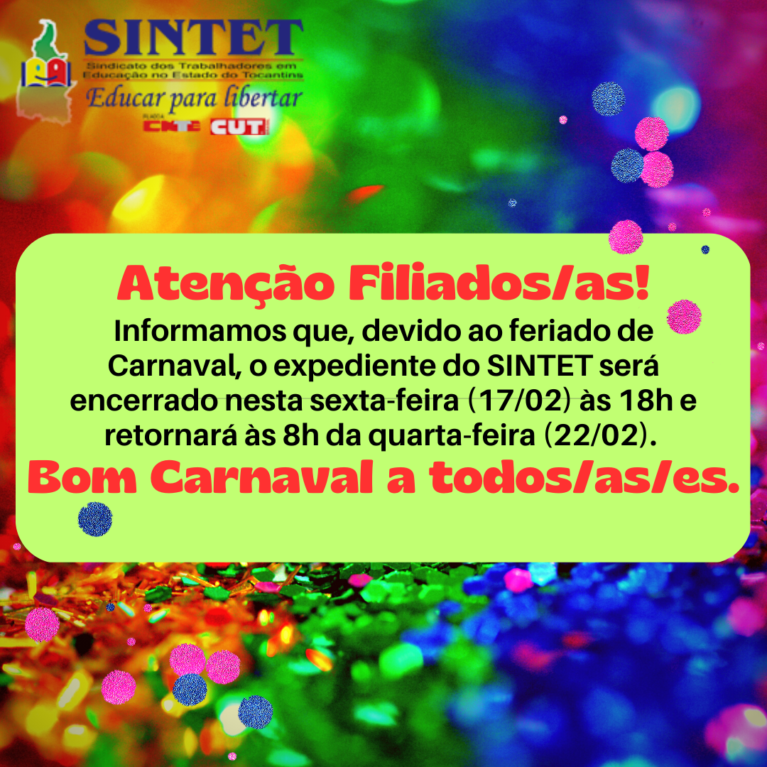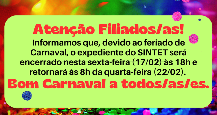 PALMAS: informamos que, devido ao feriado de Carnaval, o expediente do SINTET será encerrado nesta sexta-feira (17/02) às 18h e retornará às 8h da quarta-feira (22/02).