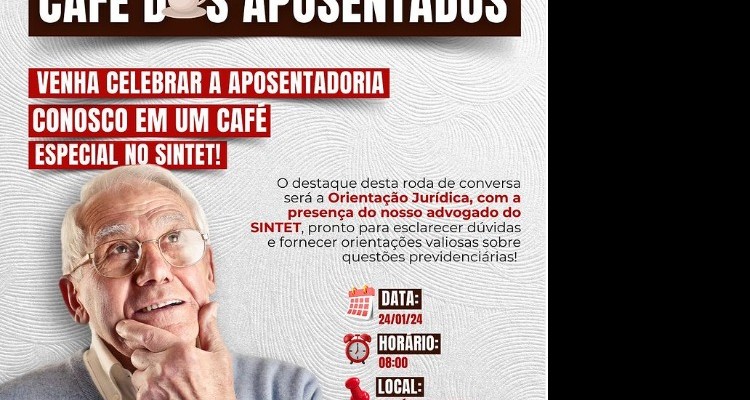 Em celebração ao Dia Nacional dos/as Aposentados/as e Dia da Previdência Social, vamos reunir educadores para um café da manhã repleto de informações e troca de ideias. Nossa equipe, junto ao advogado do sindicato, estará à disposição para oferecer orientações jurídicas importantes e compartilhar o planejamento de ações para 2024.