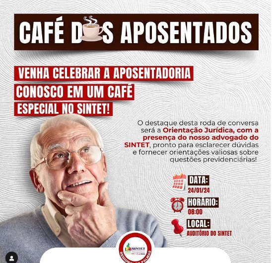 Em celebração ao Dia Nacional dos/as Aposentados/as e Dia da Previdência Social, vamos reunir educadores para um café da manhã repleto de informações e troca de ideias. Nossa equipe, junto ao advogado do sindicato, estará à disposição para oferecer orientações jurídicas importantes e compartilhar o planejamento de ações para 2024.