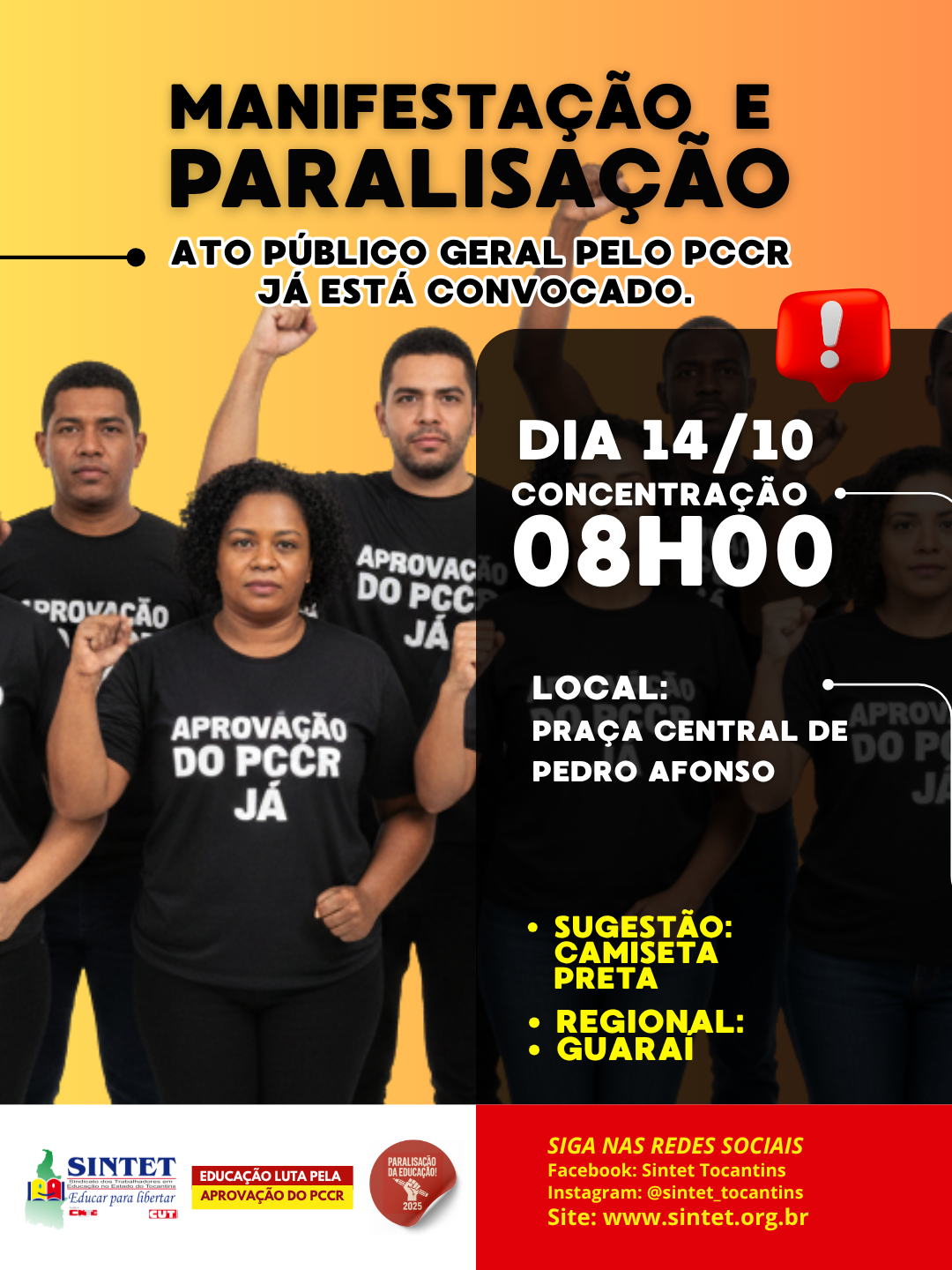O Sindicato dos Trabalhadores em Educação no Estado do Tocantins (Sintet) convoca toda a categoria para uma paralisação geral nesta terça-feira, 14 de outubro, véspera do Dia do Professor, para cobrar do Governo do Estado o encaminhamento do Plano de Cargos, Carreira e Remuneração (PCCR) da Educação à Assembleia Legislativa.