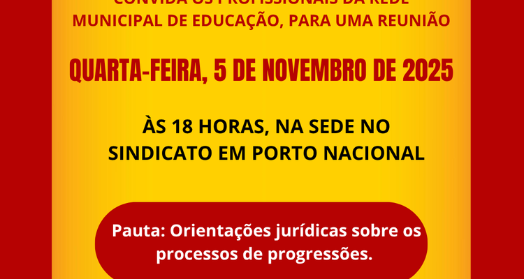 O Sintet Regional de Porto Nacional convida os profissionais da rede municipal de educação, para uma reunião na quarta-feira, 5 de novembro de 2025, às 18 horas, na sede no sindicato em Porto Nacional.