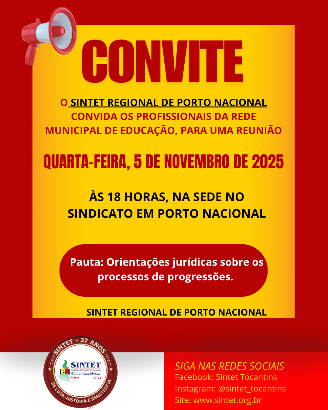 O Sintet Regional de Porto Nacional convida os profissionais da rede municipal de educação, para uma reunião na quarta-feira, 5 de novembro de 2025, às 18 horas, na sede no sindicato em Porto Nacional.