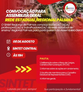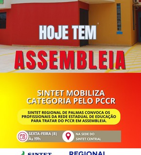 O Sintet Regional de Palmas convoca todos (as) os (as) professores (as) e trabalhadores (as) da rede estadual para participarem da Assembleia Geral, a ser realizada no dia 08 de agosto de 2025 (sexta-feira), às 19h, na sede do Sindicato, com o objetivo de discutir e deliberar sobre a mobilização do PCCR e outras demandas de interesse da categoria.