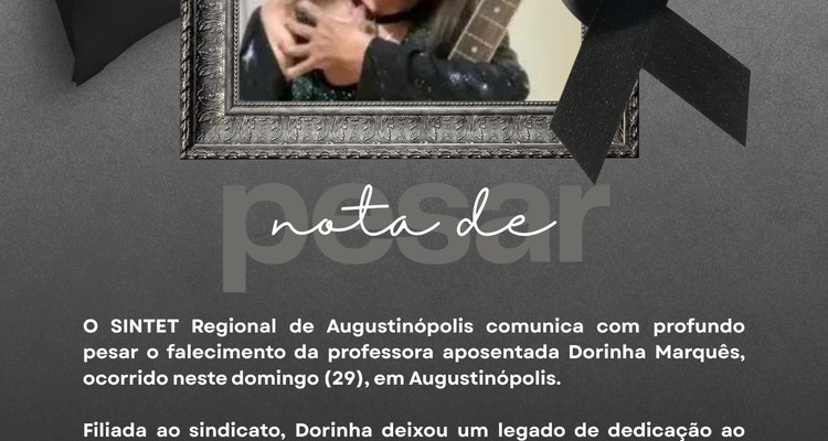 Educadora dedicada e voz ativa na cultura de Augustinópolis, Dorinha será lembrada por seu talento e sensibilidade. O SINTET se solidariza com a família e amigos neste momento de dor.